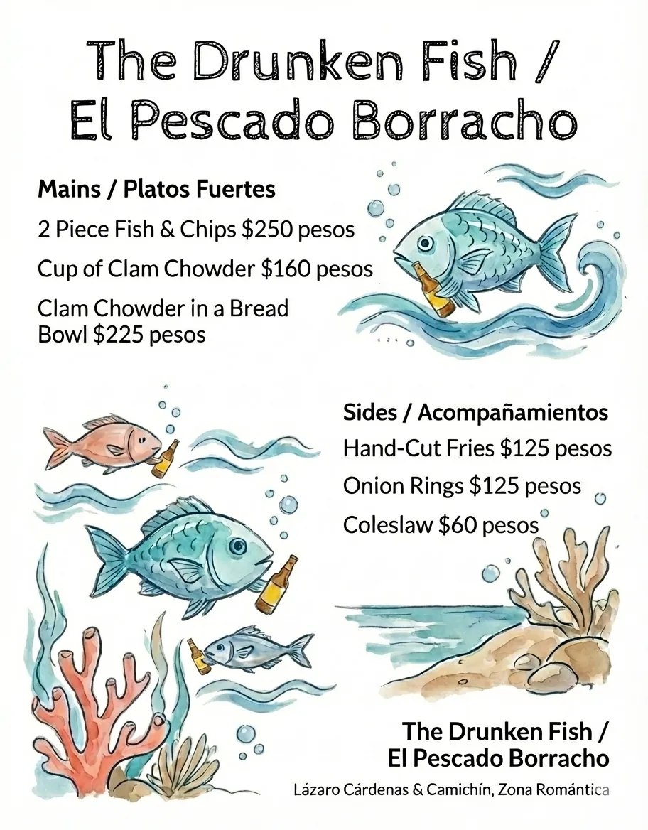 We know "Pescado" means dead fish. We screwed up the translation, but we nailed the recipe. Located steps from the Emiliano Zapata Mercado, we are your go-to for a funny, fast, and affordable British-inspired lunch. Come in, have a laugh, and finish a plate of Proper Fish & Chips before your grocery shopping goes bad.